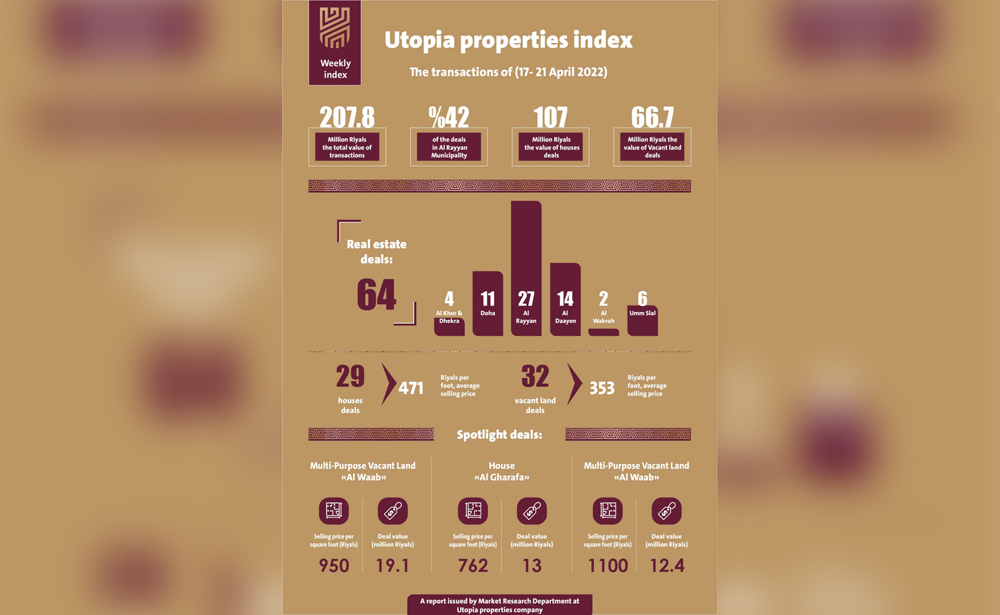 Real estate deals which have been executed during the period varied to include 32 deals of vacant land which comprised 50 percent of the total weekly deals with a total value of QR66.7m, representing 32 percent of the weekly deals value. Other transactions included 29 houses deals with a total value of QR106.8m, two multi-purpose vacant lands worth QR31.5m, and one residential building with a value of QR2.9m.