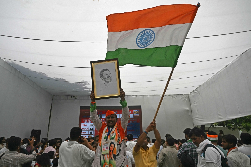 Supporters of Indian National Congress (INC) party hold a portrait of their president Rahul Gandhi and wave India's national flag to celebrate vote counting results in New Delhi on June 4, 2024. (Photo by Arun Sankar / AFP)