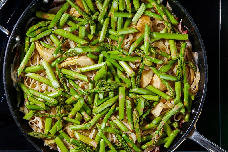 Artichoke hearts are at the center of this company's-coming dish. The recipe calls for store-bought fresh pasta. Look for asparagus spears about as thin as a pencil, so they will cook to crisp-tender. "Don't forget to cover the skillet after adding the pasta. The lid keeps the heat in the pan so the ingredients cook through properly and without excessive evaporation," Christopher Kimball writes in his Milk Street cookbook, "The World in a Skillet."