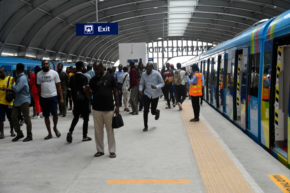 Commuters alight at the Marina Station of Lagos Blue Line rail during the inauguration of commercial operation of the mass transit in Lagos on September 4, 2023. (Photo by Pius Utomi Ekpei / AFP)