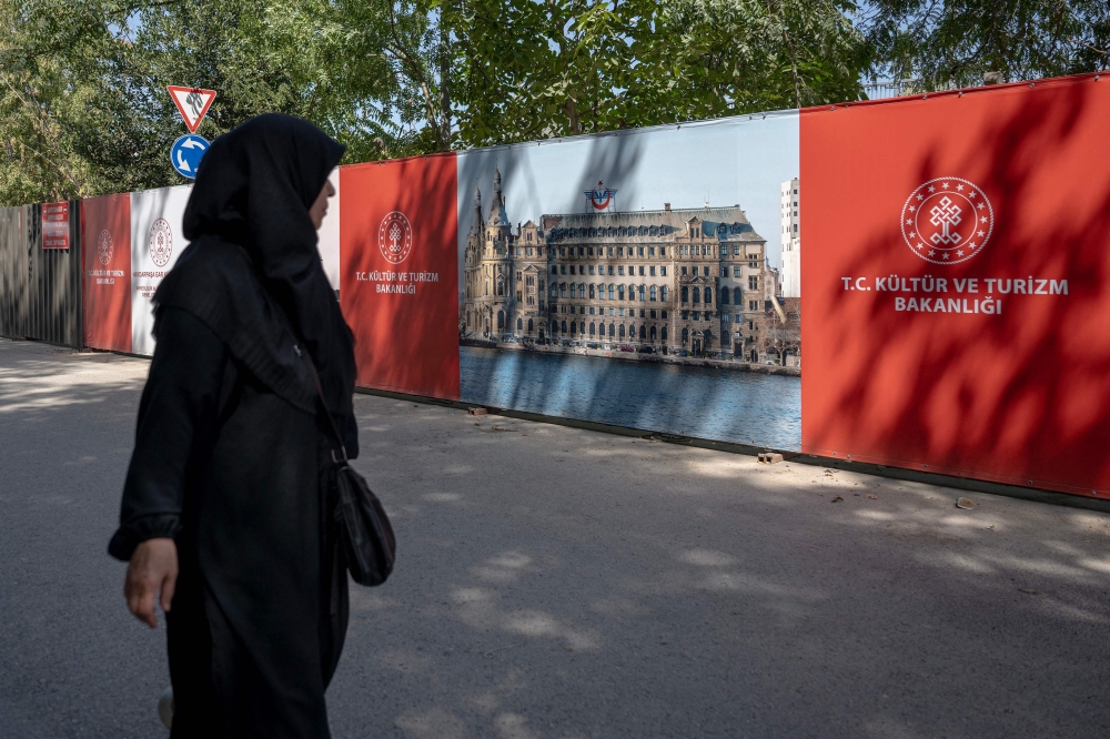A woman walks in front of banners with information on the transformation project of the Haydarpasa train station at Kadikoy in Istanbul, on August 22, 2025. (Photo by Ozan KOSE / AFP)
