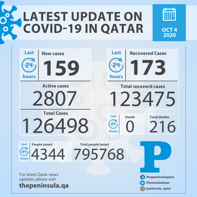 MoPH reports 159 Covid-19 cases in Qatar on October 4