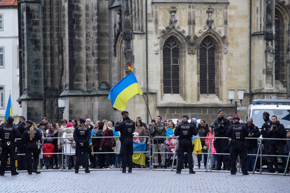 Ukrainian national flags are seen during a demonstration behind a fence in Prinzipalmarkt street during the G7 Foreign Ministers Meeting at the City Hall in Muenster, western Germany, on November 4, 2022. (AFP/Bernd Lauter)