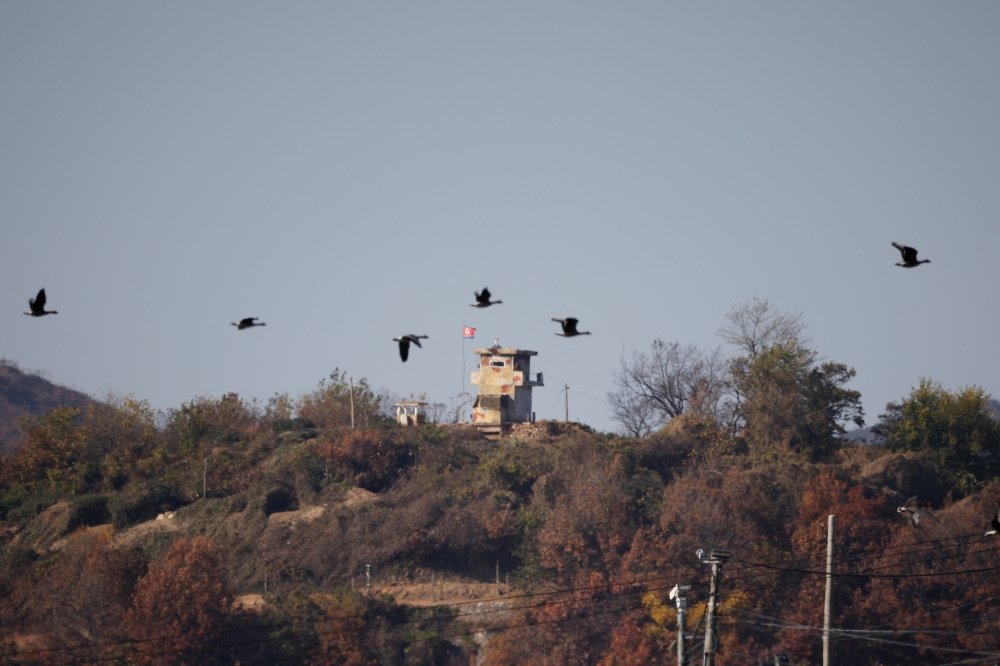 Birds fly over a North Korean guard post in this picture taken near the demilitarized zone separating the two Koreas, in Paju, South Korea, November 4, 2022. (REUTERS/Kim Hong-Ji)