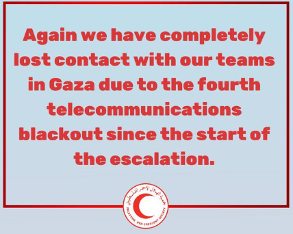 [11:36 pm Doha Time] The Palestine Red Crescent Society (PRCS) said it completely lost contact with the central operations room in the Gaza Strip as well as all its teams due to the fourth telecommunications blackout since the start of war on Gaza. “We feel extreme concern about the possibility of our teams continuing to provide emergency services,” PRCS posted on X.