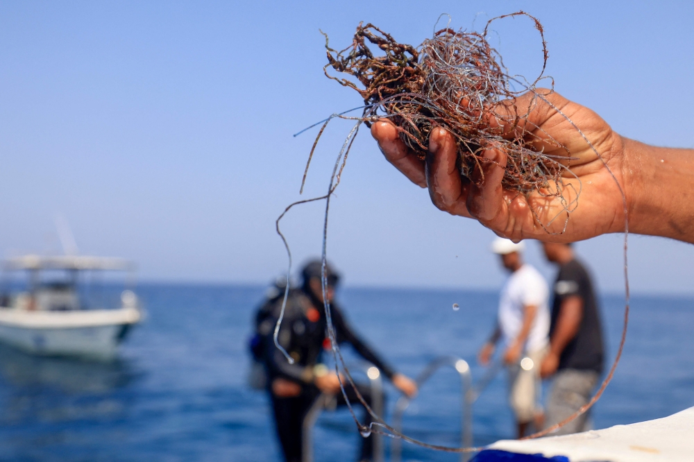 Volunteer divers remove fishing nets from coral reefs at Oman's Dimaniyat islands on October 4, 2024. (Photo by Karim Sahib / AFP)