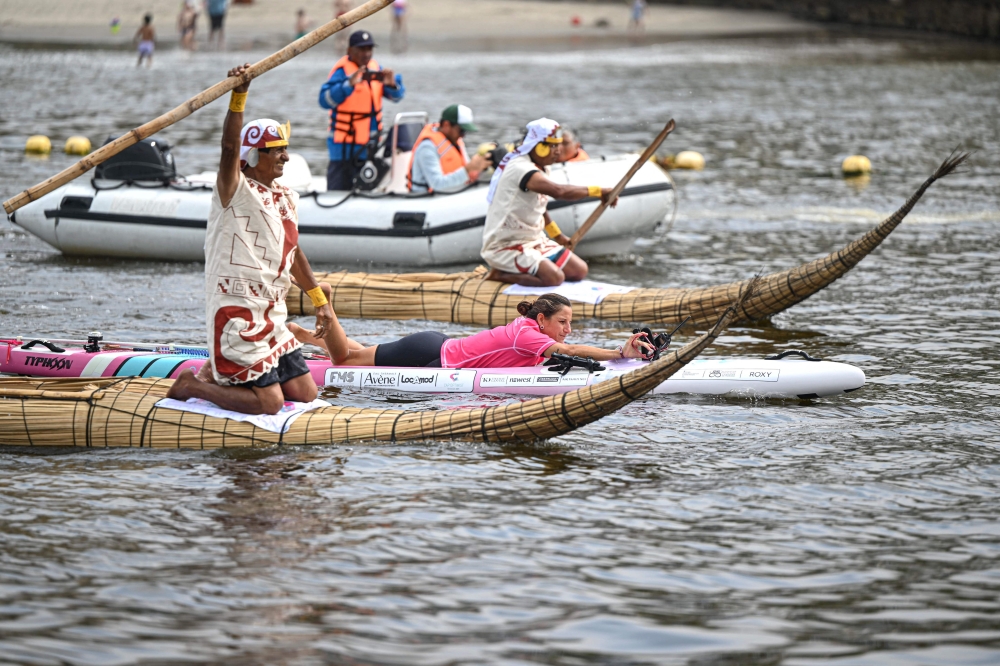 Itziar Abascal (centre) prepares her paddleboard as she departs from the Regatas Lima Club on January 4, 2023. (Photo by Ernesto Benavides / AFP)
