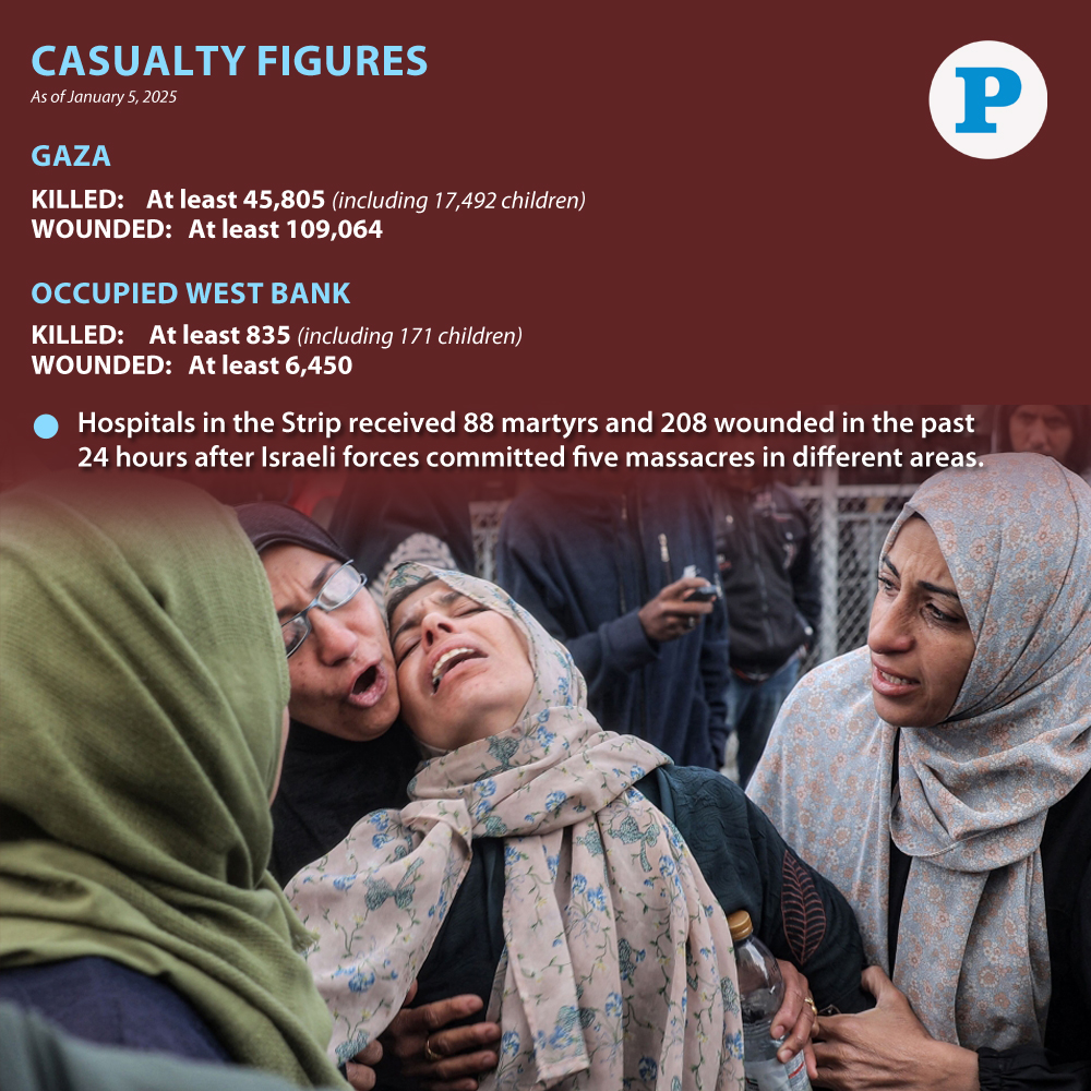 The Israeli occupation forces committed five massacres against families in the Strip, during the latest 24-hour reporting period, which killed 88 Palestinians and injured 208 others, the sources added.