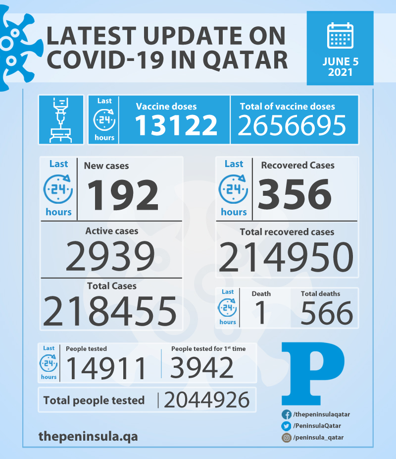 The total number of positive Covid-19 cases recorded in Qatar till now is 218,455 and there are 2,939 active cases under treatment.