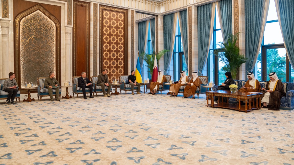 Doha, Qatar: The Amir HH Sheikh Tamim bin Hamad Al Thani met today, June 5, at his office in Lusail Palace with the President of Ukraine HE Volodymyr Zelenskyy and his accompanying delegation.