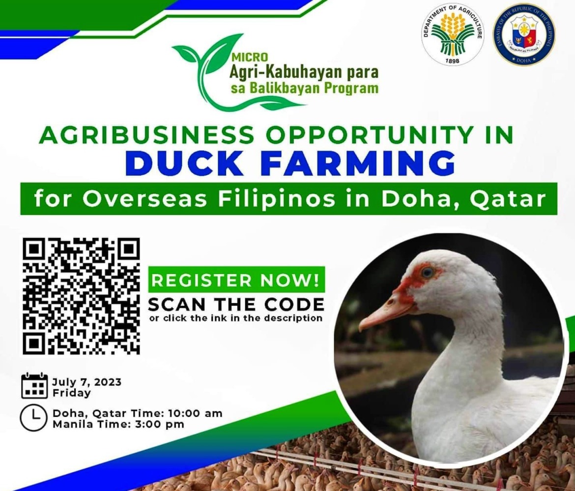 Calling all members of the Filipino community in Qatar! Discover the immense potential of duck farming, specifically tailored for Filipinos residing in Doha. This free webinar, brought to you by the collaborative efforts of the Philippine Embassy in Qatar and the Philippine Department of Agriculture, promises to deliver valuable insights and a gateway to lucrative opportunities. Learn from industry experts who will share their knowledge, strategies, and success stories in duck farming. Register here.