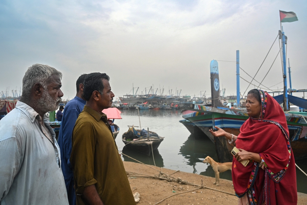 Fatima Majeed (R), a climate activist, speaks with fishermen in the town of Ibrahim Hyderi in Pakistan's Karachi. (Photo by Asif Hassan / AFP)