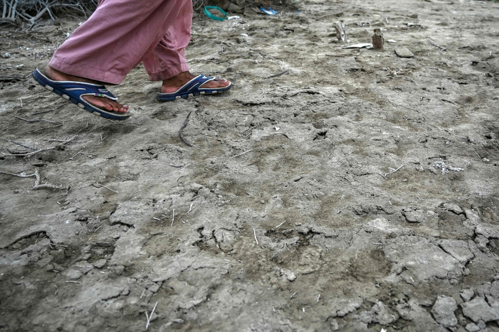 Habibullah Khatti, a local resident, walks over the salt crusts deposited in Abdullah Mirbahar village in Kharo Chan town, in the Indus delta, south of Pakistan. (Photo by Asif Hassan / AFP)