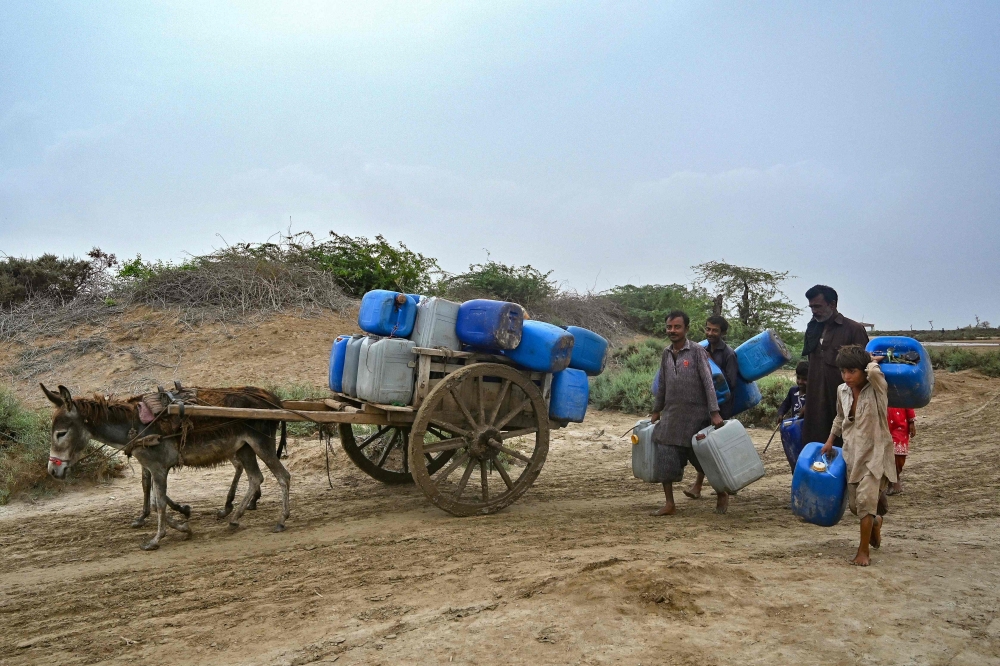 Local residents carrying water cans move towards boats that bring drinkable water to one of the island villages of Kharo Chan town. (Photo by Asif Hassan / AFP)