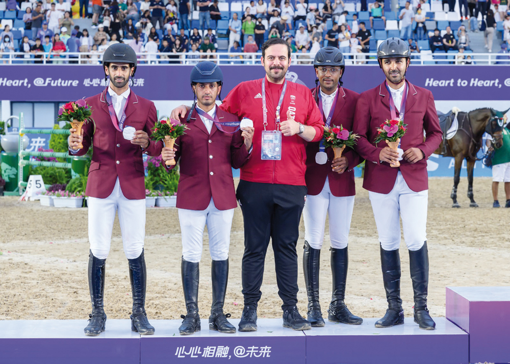 Qatar’s Bassem Hassan Mohammed, Faleh Al Ajmi, Sheikh Khalifa bin Abdulaziz Al Thani and Rashid Towaim Ali Al Marri combined to claim a silver medal in the team showjumping event.