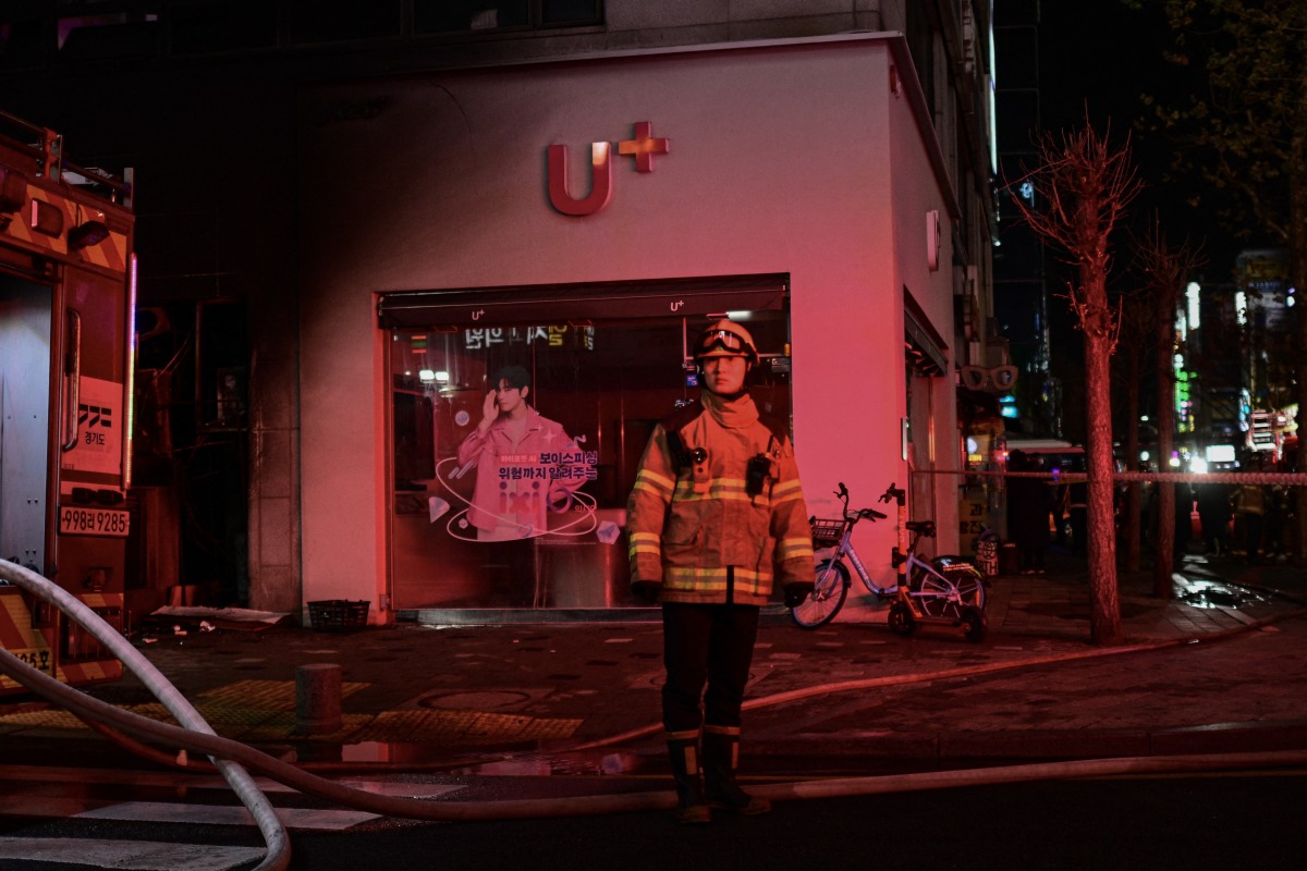 A firefighter stands in front of a commercial building that was damaged in a fire at the Bundang district in Seongnam on January 3, 2025. Photo by Philip FONG / AFP