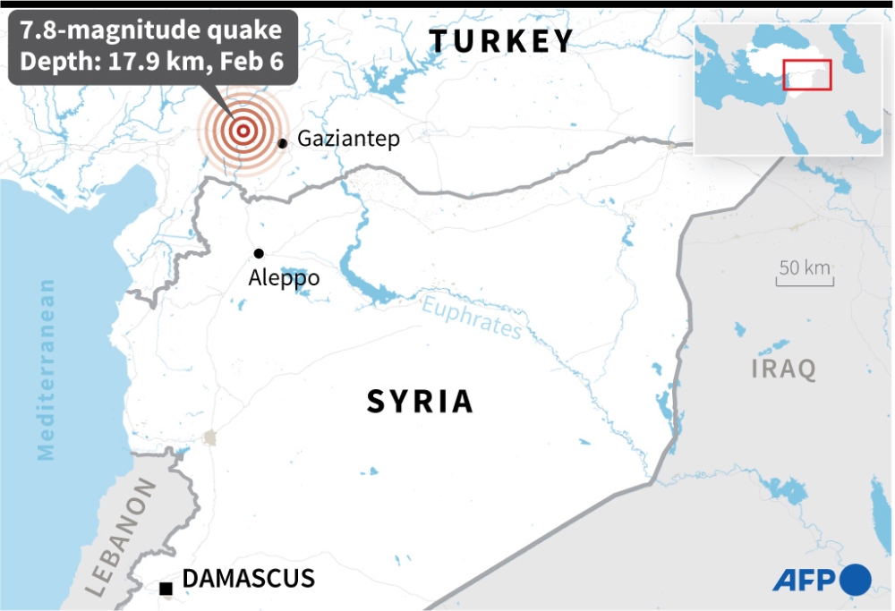 People gather around collapsed buildings as rescue teams look for survivors following an earthquake in the Syrian city of Aleppo on February 6, 2023. (Photo by AFP)
