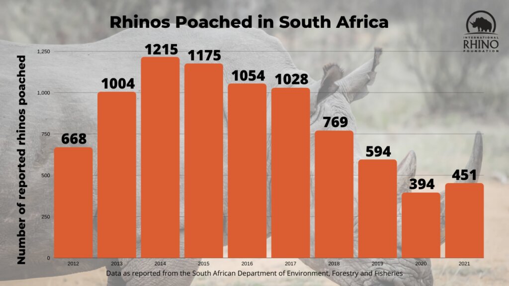 Overall, 448 rhinoceros were killed across the country, three fewer than in 2021, the environment department reported.