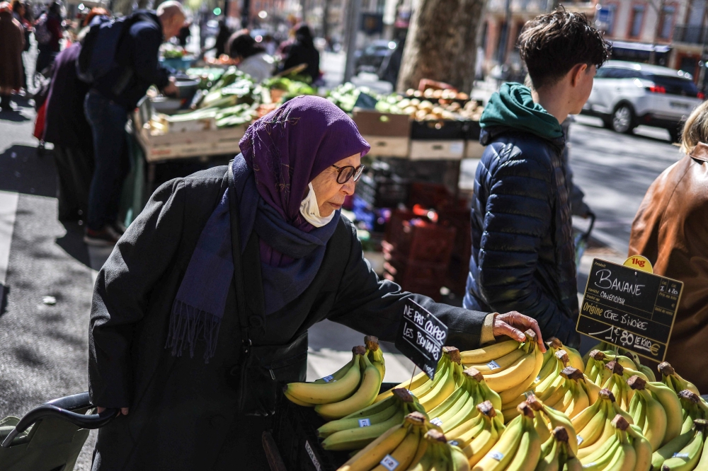 A customer shops at an outdoor fruits and vegetables market in Toulouse, southwestern France on March 5, 2023. (Photo by Charly Triballeau / AFP)