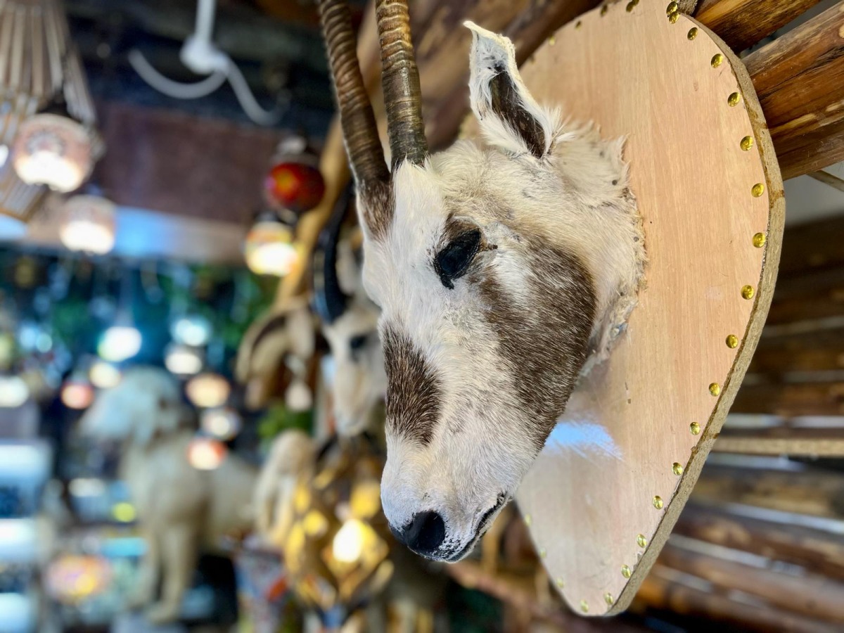 Inside the shop, the king of the jungle takes center stage, while on the walls and alongside the floor, there are gazelles, Arabian Oryx, rabbits, falcons and other preserved animals.
