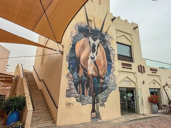 Equally captivating is “The Arabian Oryx Advances Mural” on the 11-metre-high façade of Building 40 by Argentinian artist Martin Ron. The oryx, Qatar’s national symbol of resilience and grace, bursts forward with bold, futuristic energy against a backdrop of Doha’s modern skyline. The artwork masterfully blends tradition with forward-looking ambition, reflecting a nation proud of its heritage yet confidently embracing the future.