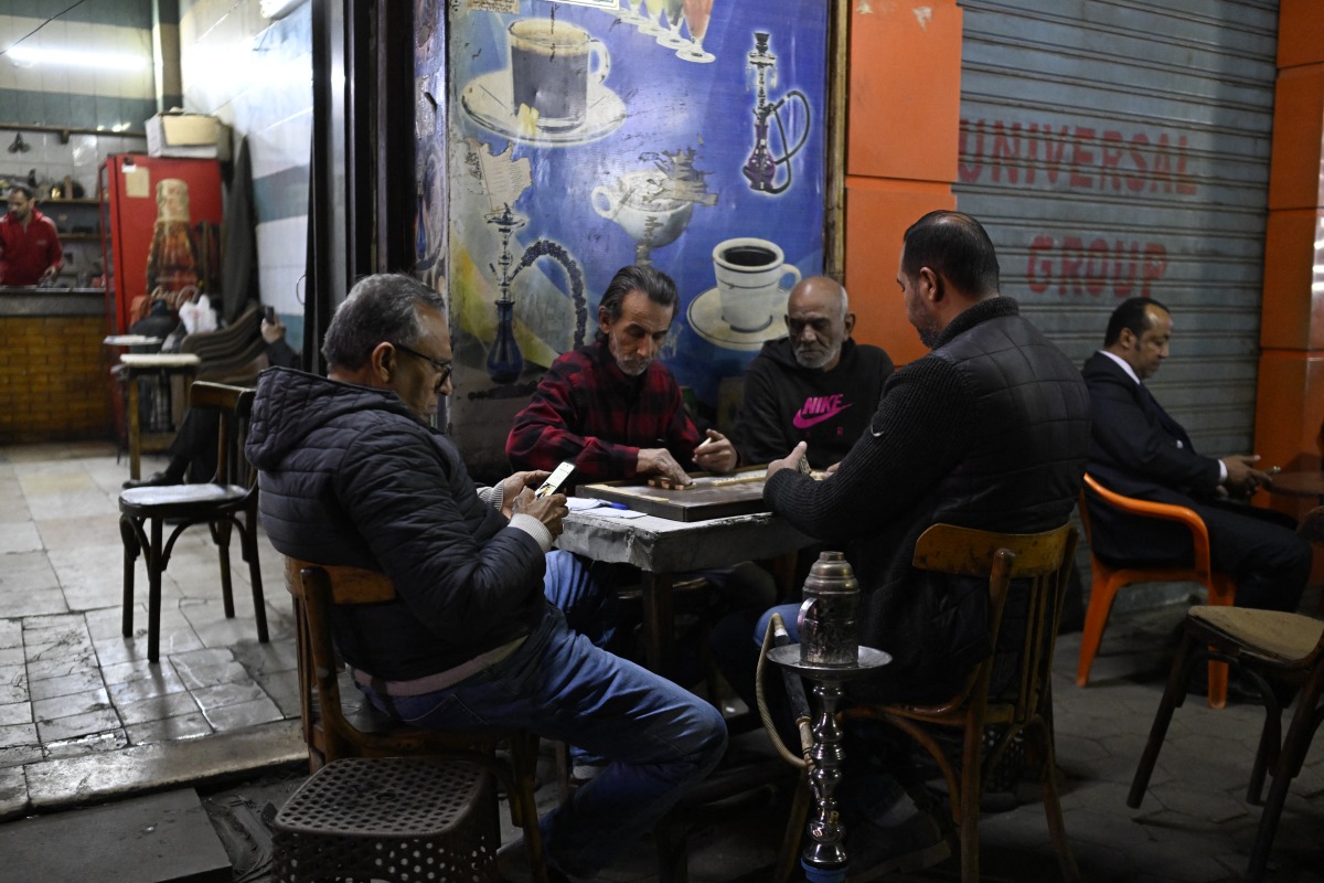 People play a game of dominos as they sit at a roadside cafe before closing in downtown Cairo on April 2, 2026. Photo by KHALED DESOUKI / AFP