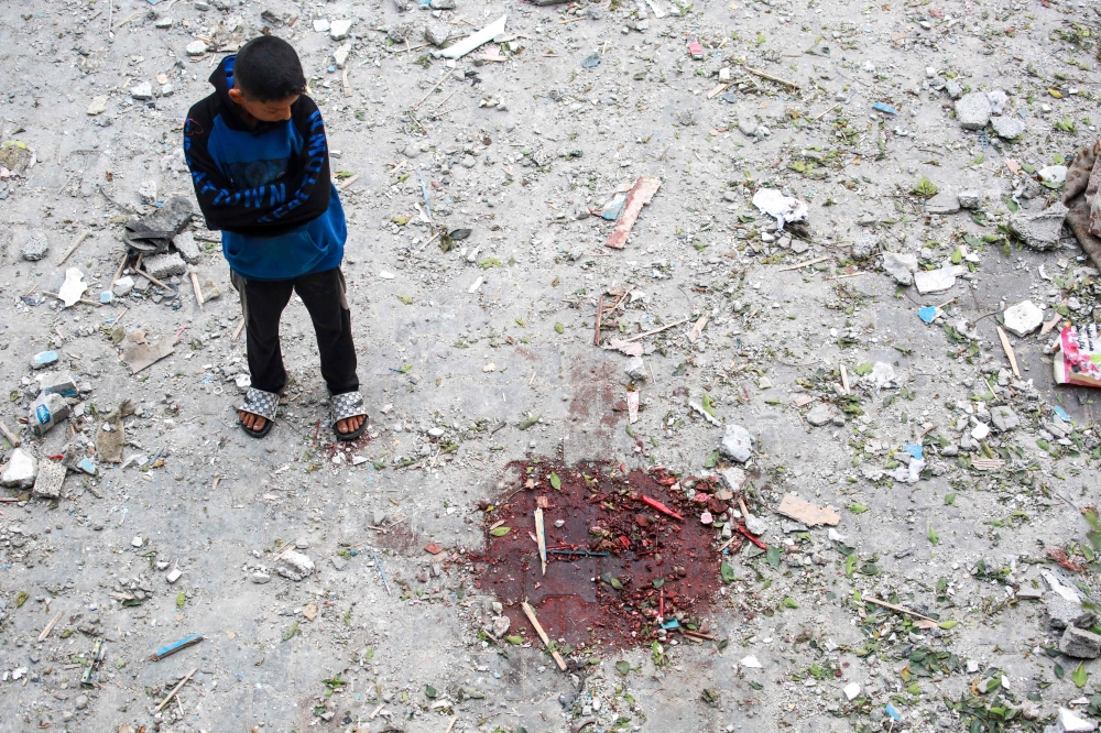 Palestinian boys stand near blood stain at a UN-school housing displaced people that was hit during Israeli bombardment in Nuseirat, in the central Gaza Strip, on June 6, 2024. Photo by Bashar TALEB / AFP