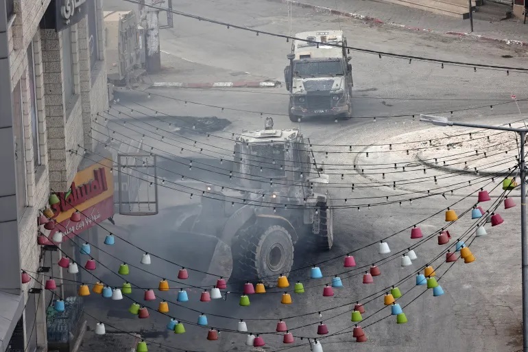 An Israeli armoured vehicle drives behind a bulldozer on a main road in Jenin in May. Photo by Zain Jaafar/AFP.