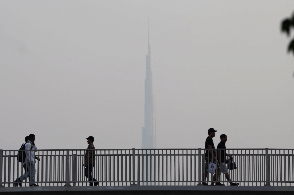 People cross a pedestrian bridge in Dubai on July 6, 2023, during a hot and foggy day. (Photo by Giuseppe Cacace / AFP)