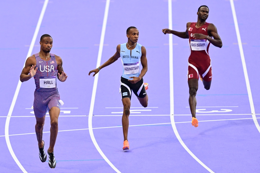 US' Quincy Hall, Botswana's Busang Collen Kebinatshipi and Qatar's Ammar Ismail Yahia Ibrahim cross the finish line in the men's 400m semi-final of the athletics event at the Paris 2024 Olympic Games at Stade de France in Saint-Denis, north of Paris, on August 6, 2024. (Photo by Martin BERNETTI / AFP)