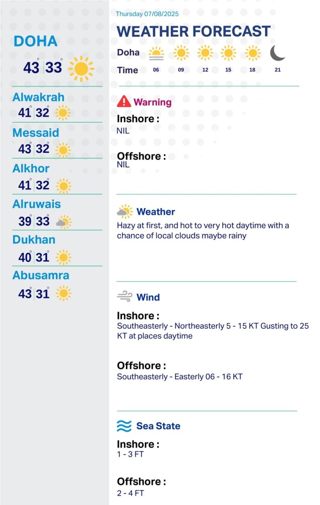 The temperatures are expected to reach 43°C in most parts of Qatar. Expect humid conditions, especially during nighttime hours.