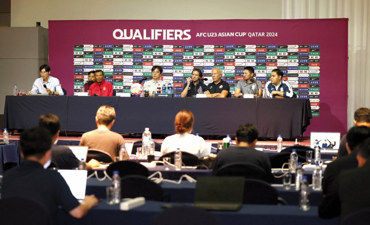 Qatar U-23 coach Ilidio Vale (third right) with coaches of other participating teams during a press conference yesterday.