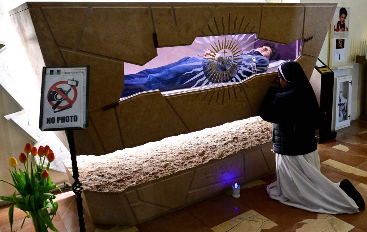 A nun prays at the tomb of Blessed Carlo Acutis, an adolescent who spent his life spreading his faith online, earning the moniker "God's Influencer", in the Shrine of the Renunciation in Assisi, part of the Church of Saint Mary Major, on April 3, 2025. Photo by Tiziana FABI / AFP