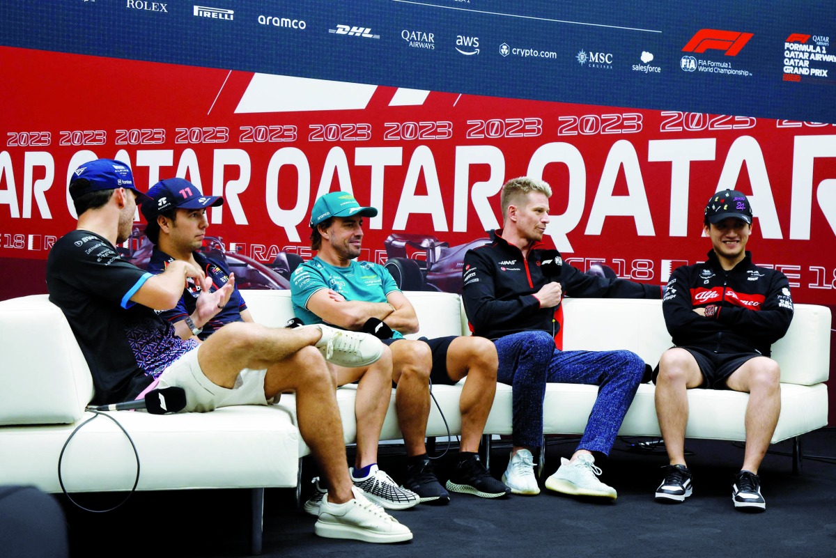 FROM LEFT: Alpine’s Pierre Gasly, Red Bull Racing’s Sergio Perez, Aston Martin’s  Fernando Alonso, Haas' Nico Hulkenberg, and Alfa Romeo’s Zhou Guanyu during a press conference in Lusail, yesterday.