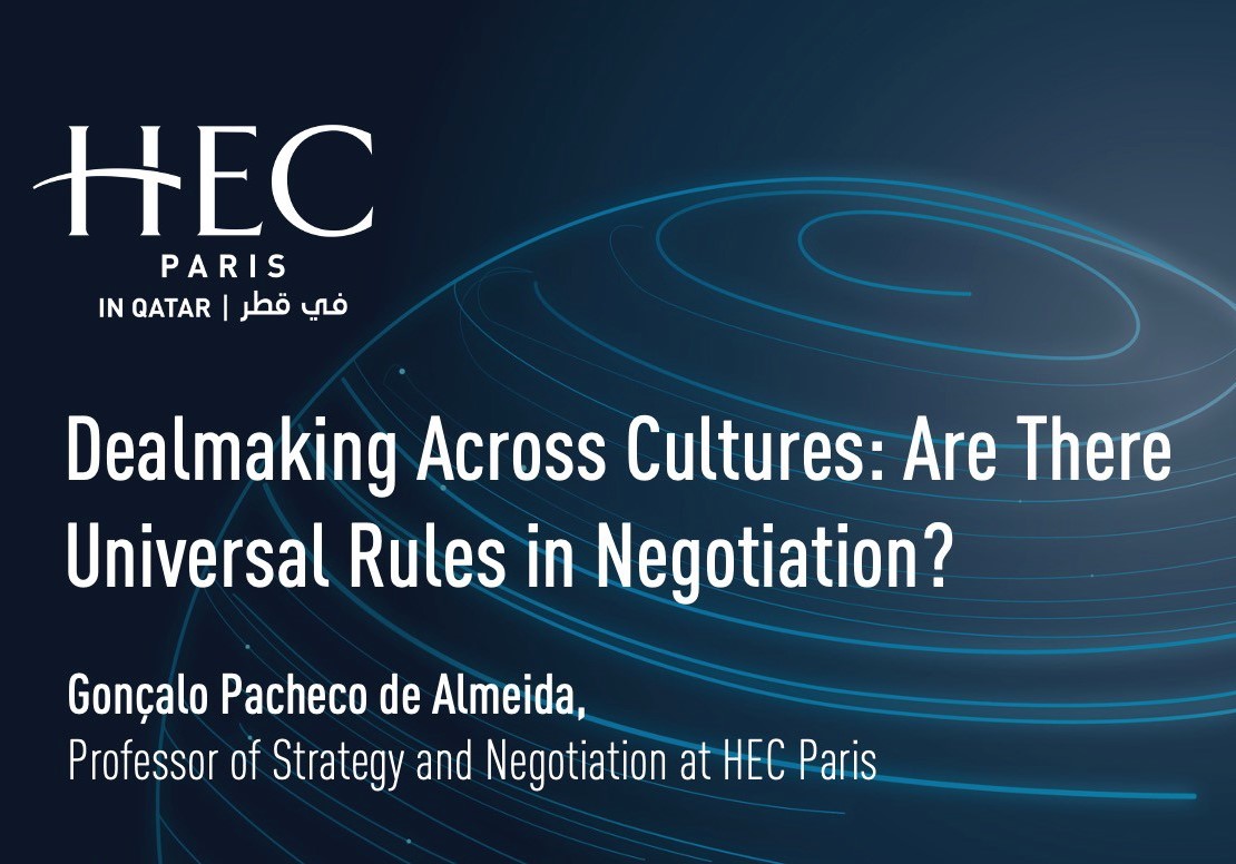 Are there universal rules in negotiation? Join Professor Gonçalo Pacheco de Almeida, the Dieter Schwarz Foundation Chaired Full Professor of Strategy and Negotiation at HEC Paris, in his insightful masterclass on cross-cultural negotiation. This session, tailored for both international and local contexts, addresses the challenges of dealmaking by incorporating a live negotiation exercise. It will also cover universal negotiation principles and essential do's and dont's. Register to enhance your negotiation skills and gain valuable insights.