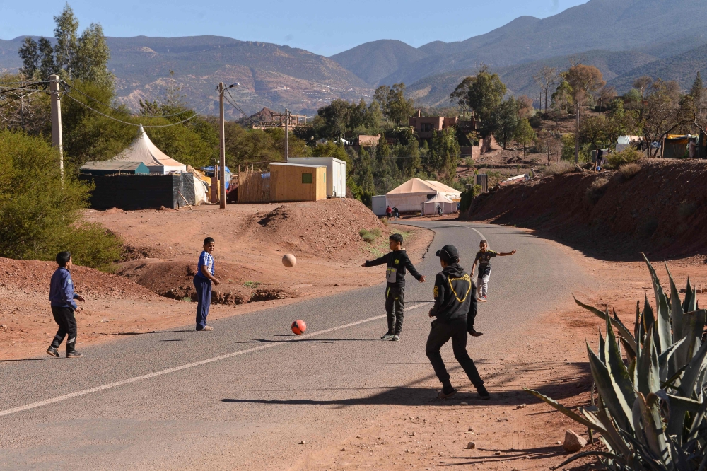 Displaced Moroccan boys play football on a road near a temporary camp set up following the September 8 earthquake, in the hamlet of Imzilne in the Ouirgane commune, some 60 kilometres south of Marrakesh, on November 27, 2023. Photo by AFP