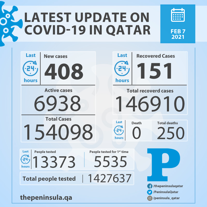 Doha: Ministry of Public Health (MoPH) today reported 408 new cases of coronavirus (Covid-19) and 151 people recovered from the virus in the last 24 hours, bringing the total number of people recovered in Qatar to 146,910.