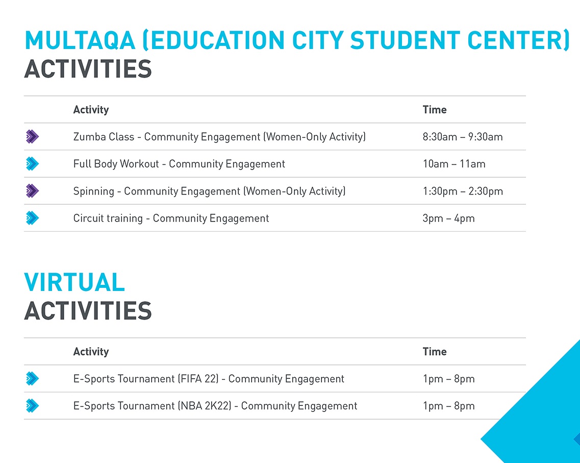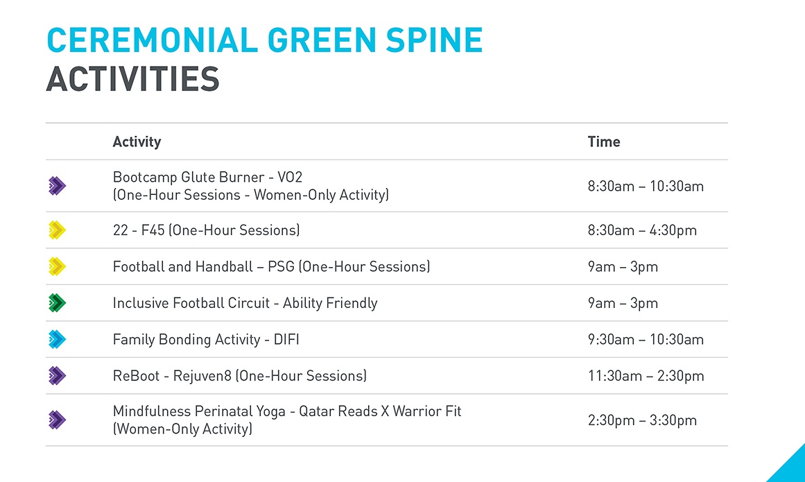 These activities — which require pre-registration via a dedicated website or the Education City app — will run from 8am until 5pm at Oxygen Park, Green Spine, the Ceremonial Court, and Multaqa (Education City Student Center).