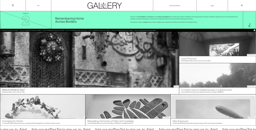 Shaaban further explains, “We aimed for a casual, inviting feel that inspires conversations. Hence the website was designed to look more like a blog with a number of different stories or parallel tabs that fit under an issue’s specific theme, than a corporate landing page. A regular visitor to the site will notice how the storylines on the main page change over the span of an issue – usually two months – as we update additional parallels to it. The viewer gets to see a narrative that starts with an exhibition opening, but then extends far beyond that in terms of offering complementary information to the visitor. This helps the viewer gain a wider understanding of an exhibition or event in relation to the theme.”