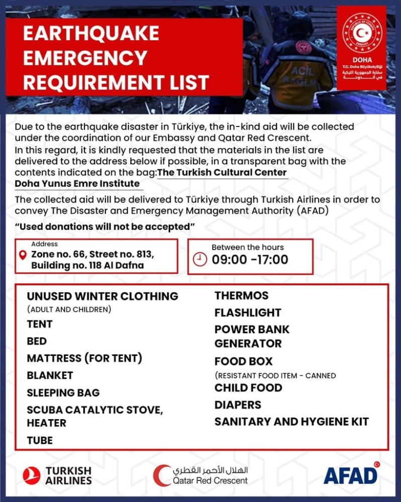 The donated materials, which are expected not to be old and used, are to be put in transparent bags (if possible) and delivered to the aforementioned address, and they will subsequently be sent to Türkiye's Disaster and Emergency Management Authority (AFAD) through Turkish Airlines.