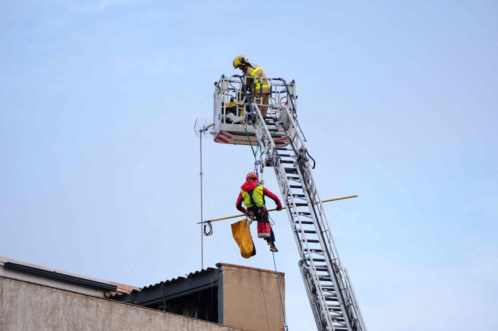 Firefighters inspect a building from a ladder as emergency services are looking for potential victims after a habitation building has collapsed, in Badalona on February 6, 2024. (Photo by Pau Barrena / AFP)