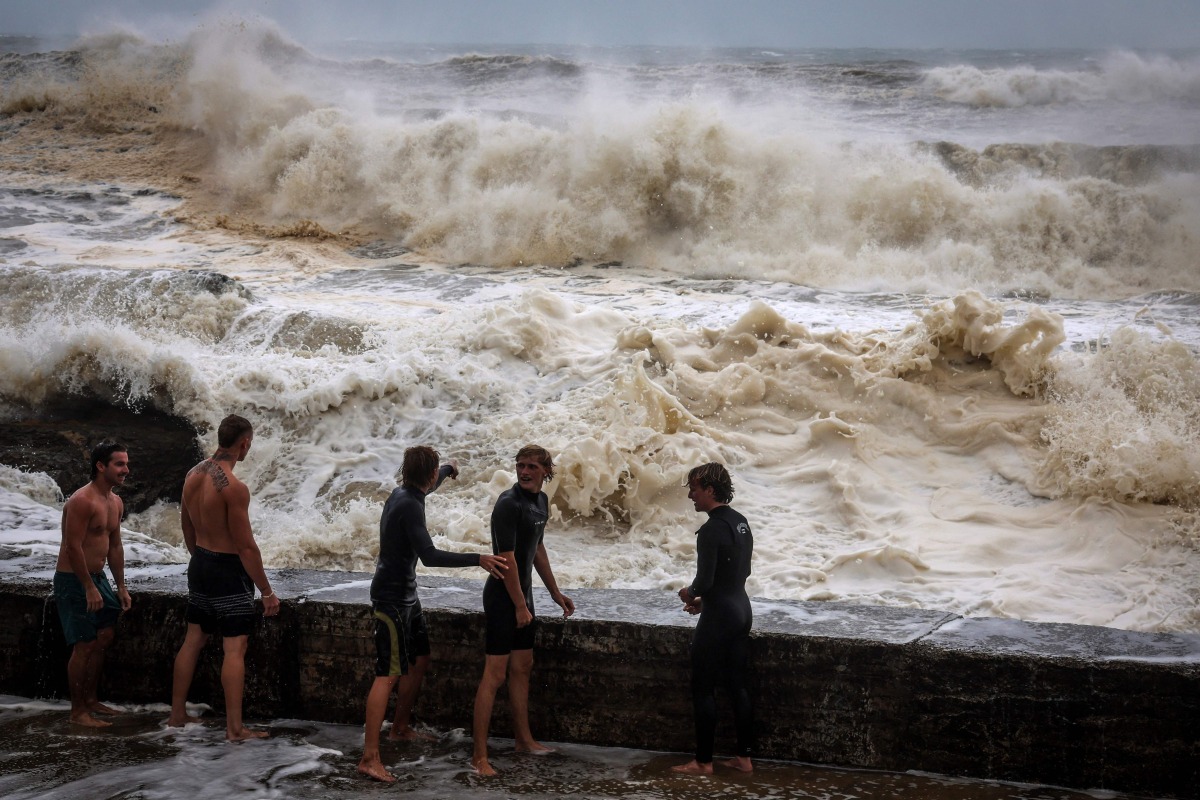 Young men stand behind a wall as they play in record-breaking waves caused by the outer fringe of Tropical Cyclone Alfred at Point Danger in Coolangatta on March 7, 2025. Photo by DAVID GRAY / AFP