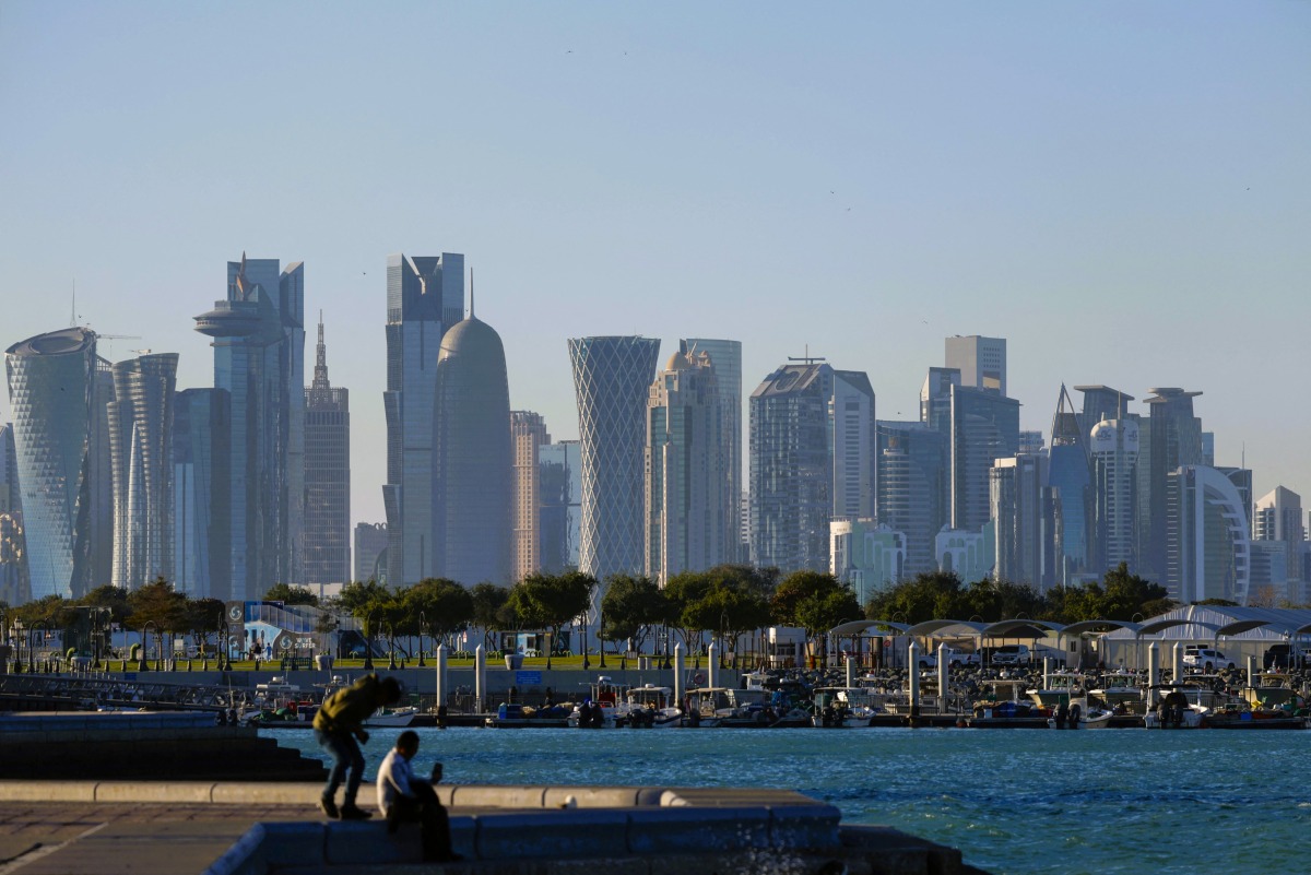 Men sit at the Doha Corniche backdropped by high buildings in Doha on March 3, 2025. Photo by KARIM JAAFAR / AFP