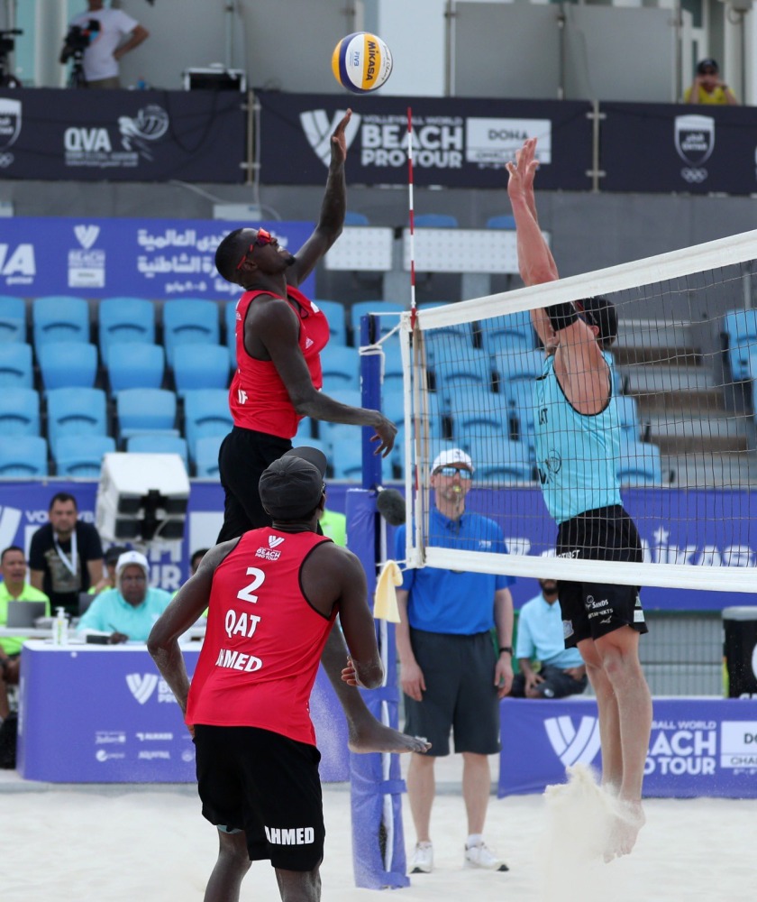 Qatar's Cherif Younousse and Ahmed Tijan in action during their opening match of the Volleyball World Beach Pro Tour Doha Challenge at Al Gharafa Beach Courts yesterday.