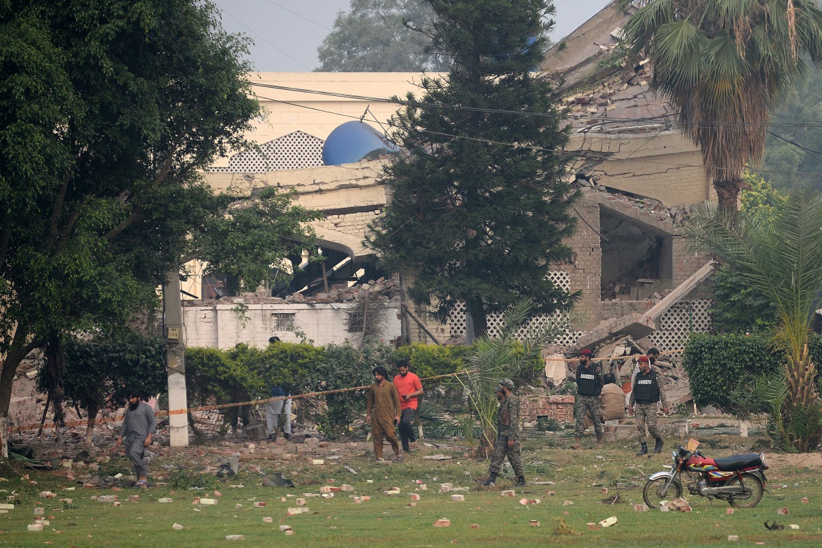 Paramilitary soldiers inspect a collapsed building of the Government Health and Educational complex after Indian strikes in Muridke, about 30 kilometres from Lahore, on May 7, 2025. Photo by Murtaz Ali / AFP.