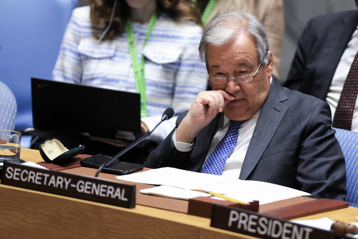 UN Secretary-General Antonio Guterres looks on during a UN Security Council meeting at the UN headquarters in New York City on April 29, 2025. Photo by CHARLY TRIBALLEAU / AFP.