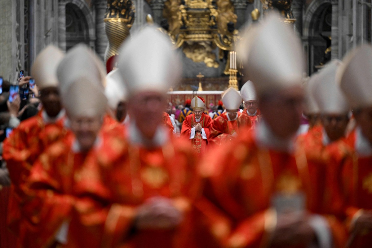 This photo taken and handout on May 7, 2025 by The Vatican Media shows cardinals during a holy mass for the Election of the Roman Pontiff, prior to the start of the conclave, at St Peter's Basilica in The Vatican. (Photo by Handout / VATICAN MEDIA / AFP)