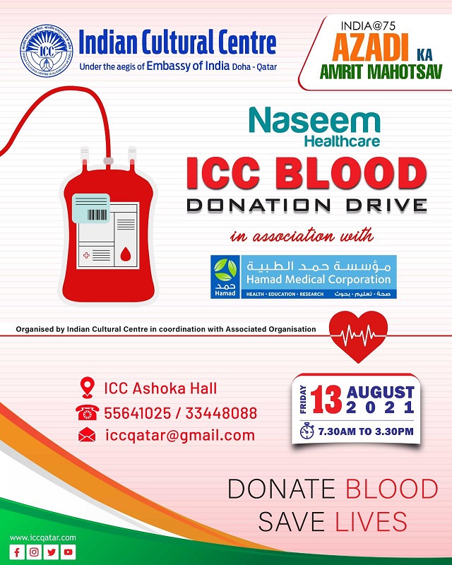 Doha: As part of India @75, “Azadi Ka Amrut Mahotsav”, on August 13, 2021, the Indian Cultural Center (ICC) is organising a blood donation drive in coordination with Hamad Medical Corporation. Over 500 donors have already come forward for the drive, ICC officials said.