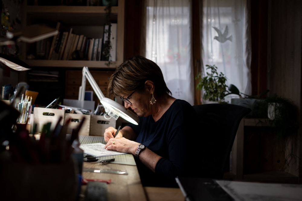 Swiss paper cutting artist Marianne Dubuis works on a piece at her home, in Chateau d'Oex, in the Prealps in western Switzerland on July 25, 2023. Photos by Fabrice COFFRINI / AFP