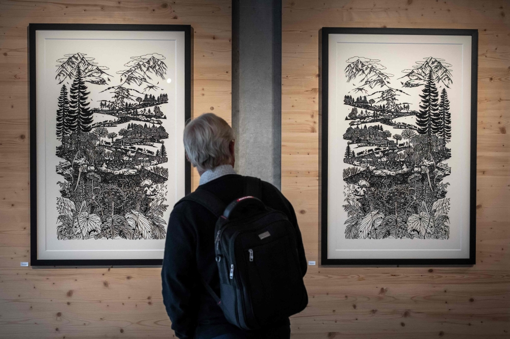 A visitor looks on to large works by Swiss paper cutting artist Marianne Dubuis during an exhibition at the Swiss Centre of Paper Cut in Chateau d'Oex, in the pre-Alps in western Switzerland, on July 25, 2023.